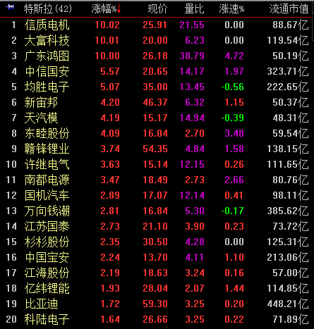 9:34,创业板涨0.64%,特斯拉领涨,大富科技、广东鸿图领涨;国光电器、大众交通目前垫底,个股全部翻红。