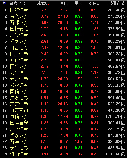 13:48,沪指涨1.51%,报3055%,创猴年以来反弹新高,成交略增至1836亿元,权重股中券商涨速居首,涨幅达3%,4大黑手中的西部证券冲击涨停,国海证券、东兴证券大幅跟涨,个股全部飘红,西南证券、国泰君安目前垫底;新能源汽车概念股仍报保持领涨地位。