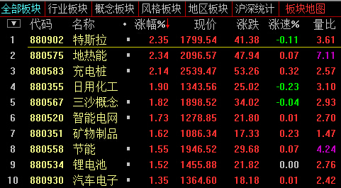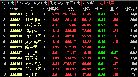 13:24,创业板涨2.86%,报2268,成交同比略增至726亿元,特斯拉、充电桩保持领涨,锂电池跟涨,新能源汽车主题共15股涨停;阿里、电商、国产软件午后拉升。