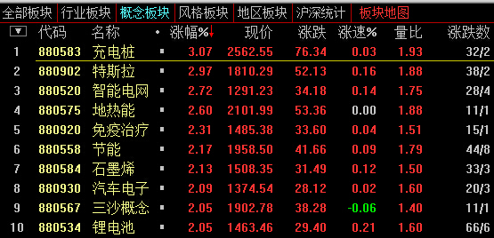 13:44,创业板涨3.34%,报2279,成交同比略增至837亿元。新能源汽车主题午后充电张、特斯拉、锂电池概念共16股涨停。