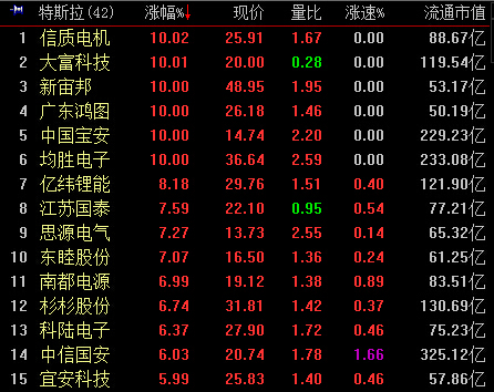 10:23,创业板涨0.99%,报2228,成交同比微降至329亿元,新能源汽车主题3类概念中,钱江摩托、当升科技、信质电机、茂硕电源等8股涨停,同和科技、中国宝安、新宙邦、西部资源等大幅跟涨。